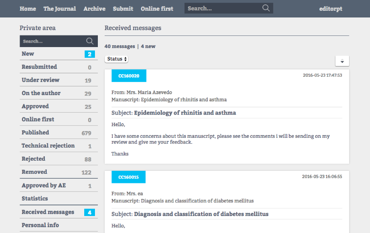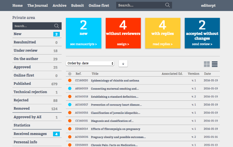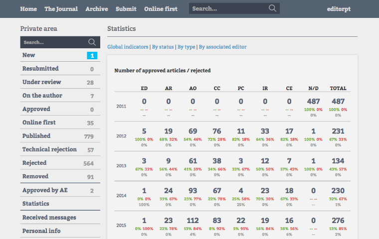 A statistics section is available exclusively to the chief editor, tracking how long the reviewers are taking in their assessments, the ratio of approved and rejected manuscripts, and on how many manuscripts have associate editors worked.